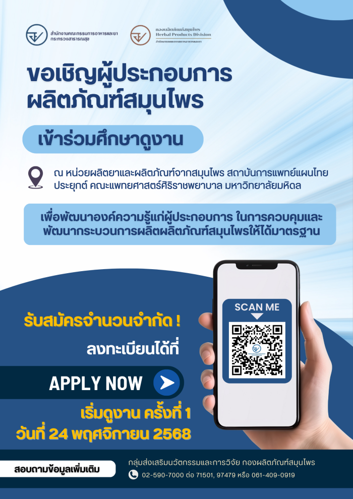 โครงการอบรมสําหรับผู้มีหน้าที่ปฏิบัติการในสถานที่ผลิตผลิตภัณฑ์สมุนไพร